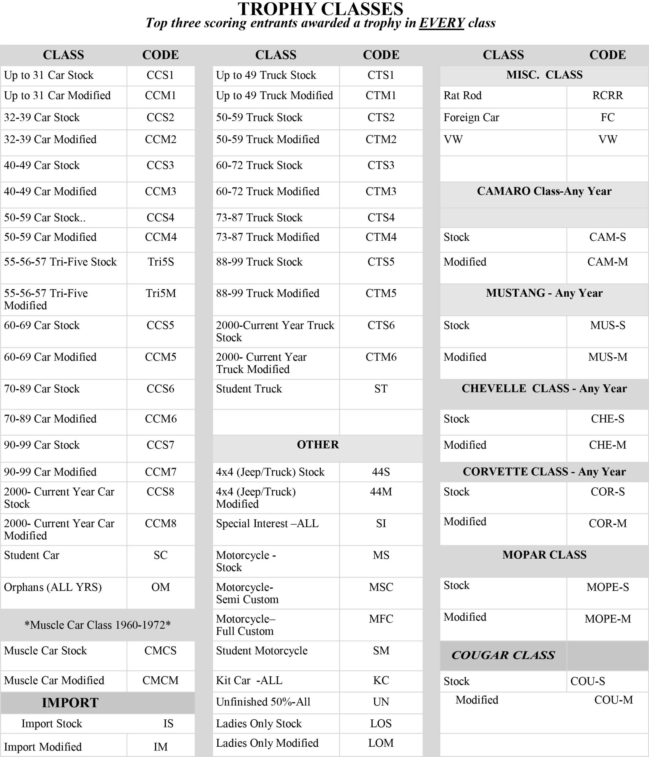 See the Trophy Classes below – use for reference when registering your vehicle below.